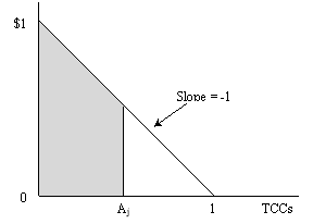 This reduction procedure will use the same optimization model that will be used in the Centralized TCC Auction to determine the amount by which Table 1 ETCNL/TCCs will be reduced. Each of the TCCs and Grandfathered Rights listed in Section 19.8.2 (i) above will be represented in the Centralized TCC Auction model by a fixed injection of 1 MW at its Point of Injection, and a fixed withdrawal of 1 MW at its Point of Withdrawal. In addition, Table 1 ETCNL/TCCs will be represented in the model, but they will be represented in such a way as to allow their reduction. To do so, bids for each Table 1 ETCNL/TCC will consist of a line which intersects the y-axis at $1/TCC (or any other value selected by the ISO, so long as that value is constant for each bid curve for all of these Table 1 ETCNL/TCCs) and which intersects the x-axis at 1 MW. An example of the bid curve Bj for a representative Table 1 ETCNL/TCC is illustrated in the diagram below.