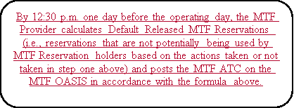 Default Release MTF Reservations equal to the difference between: (A) the quantity, in MW, of (i) validated Bids that were submitted to the ISO’s Day-Ahead Market by MTF Reservation holders, plus (ii) validated Bids that were submitted to the ISO’s Real-Time Market by MTF Reservation holders by noon, the day before the relevant real-time operating day, plus (iii) hourly voluntary releases that have been posted by MTF Reservations holder(s) by noon, the day before the relevant real-time operating day; and (B) the expected capability of the MTF determined by the MTF Provider for each real-time scheduling hour, shall be released for acquisition by third parties and posted on the MTF Provider OASIS as Available Transfer Capability by 12:30 p.m. on the day before the real-time operating day. Default Release MTF Reservations for the released capability will be issued on a first-come, first-served basis through the MTF Provider OASIS to eligible Transmission Customers that meet the posted rate.