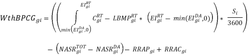 = Bid cost submitted by Supplier g, or when applicable the mitigated Bid cost for Supplier g, in the RTD for the hour that includes RTD interval i expressed in terms of $/MWh, except in intervals in which the dispatch of the Supplier is constrained by its downward ramp rate for that interval, unless that Supplier was scheduled to provide Regulation Service in that interval and its RTD basepoint was less than its AGC basepoint, and except in hours in which the NYISO has increased Supplier g’s minimum operating level, either (i) at the Supplier’s request including through an adjustment to the Resource’s self-commitment schedule, or (ii) in order to reconcile the ISO’s dispatch with the Supplier’s actual output or to address reliability concerns that arise because the Supplier is not following Base Point Signals, in which case CgiRT shall be deemed to be zero;