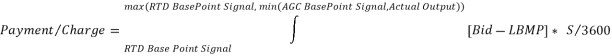 For any interval in which a Supplier that is providing Regulation Service receives an AGC Base Point Signal that is higher than its RTD Base Point Signal, it shall receive or pay a RRAP or RRAC calculated under the terms of this subsection. If the Energy Bid Price of such a Supplier is higher than the LBMP at its location in that interval, the Supplier shall receive a RRAP. Conversely, for any interval in which such a Supplier’s Energy Bid Price is lower than the LBMP at is location at that interval, the Supplier shall be assessed a RRAC. RRAPs and RRACs shall be calculated using the following formula: