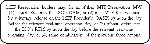 The scheduling rights associated with annual, monthly, weekly or daily MTF Reservation include the ability to participate in both the ISO’s Day-Ahead and Real-Time Markets. Hourly voluntary release MTF Reservations and Default Release MTF Reservations only allow participation in the ISO’s Real-Time Market.