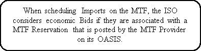 Obtaining a MTF Reservation is a prerequisite to scheduling an External Transaction on the MTF in the ISO’s Day-Ahead or Real-Time Energy Market. A Transmission Customer holding a MTF Reservation and otherwise meeting the qualifications for submitting transactions under the New York Independent System Operator, Inc.’s (“ISO’s”) Tariffs may submit Bids to schedule Import transactions on the MTF up to the total MW amount of the MTF Reservation.